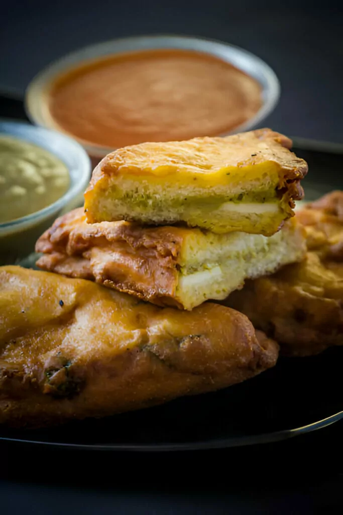 Pair bread pakoras with vibrant dips like green coriander chutney, tamarind chutney, or classic tomato ketchup for a sweet-spicy balance.