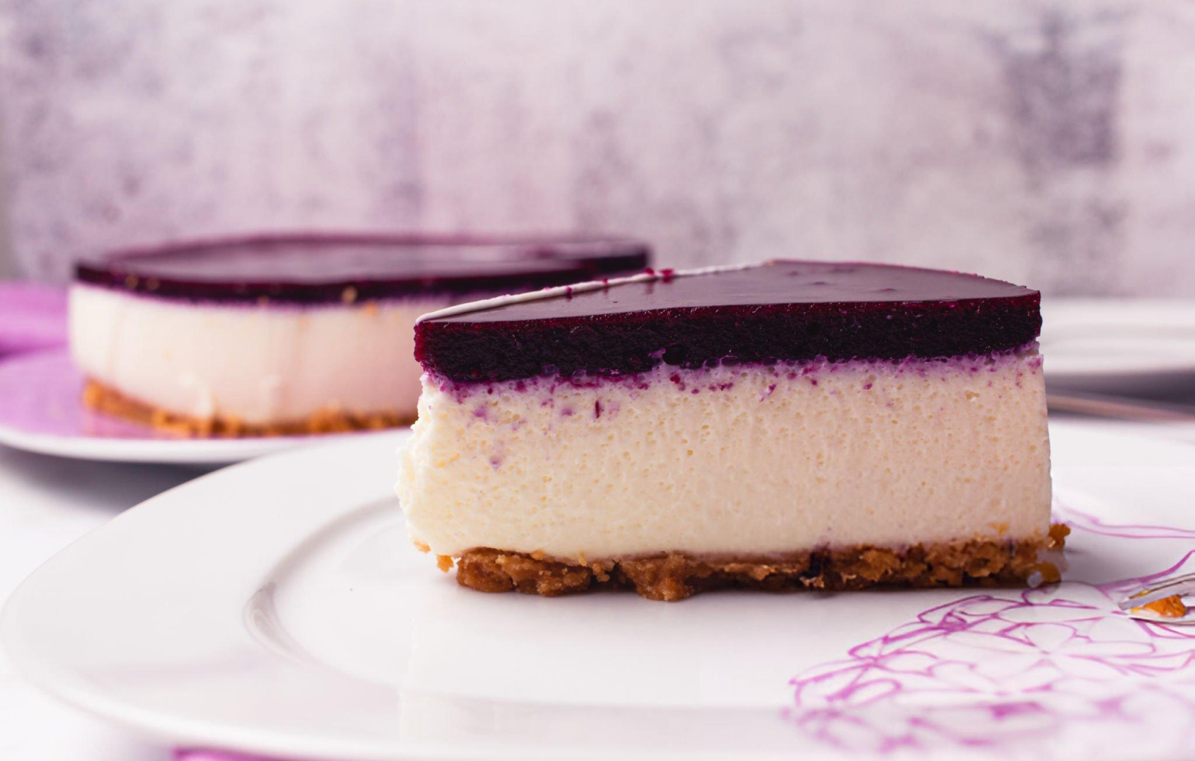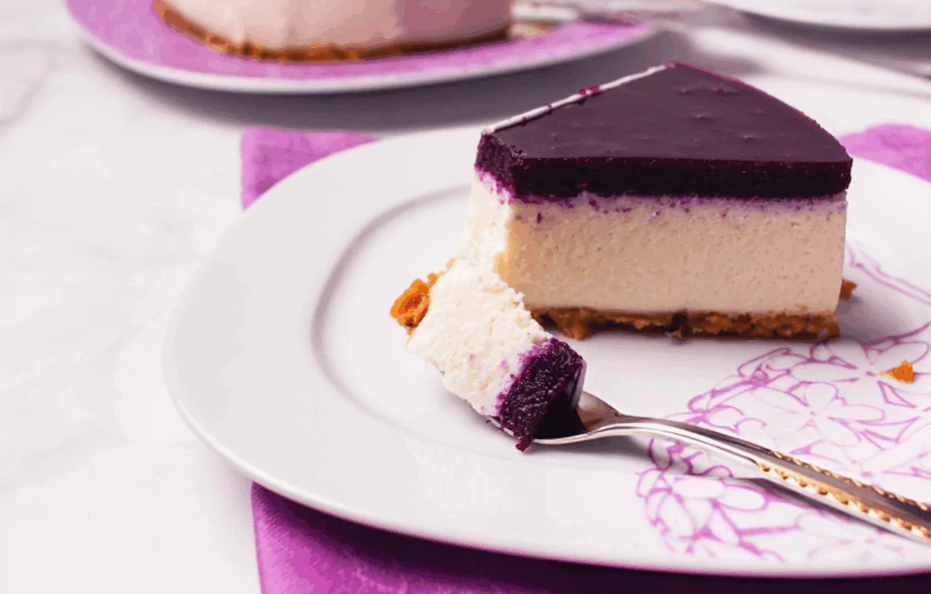 - Carefully transfer the mixture to a blender or food processor and purée until smooth. Pour the blueberry topping over the cheesecake layer and spread it gently to create an even, glossy finish.