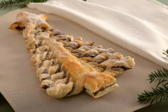 From the reserved pastry scraps, cut out a star shape and place it at the top of the tree. Next, use a sharp knife or pizza cutter to slice 1/2-inch wide “branches” along both sides of the tree, taking care to leave a 1-inch uncut section running down the center to maintain structure. Gently twist each branch to create a spiral effect for a festive look.