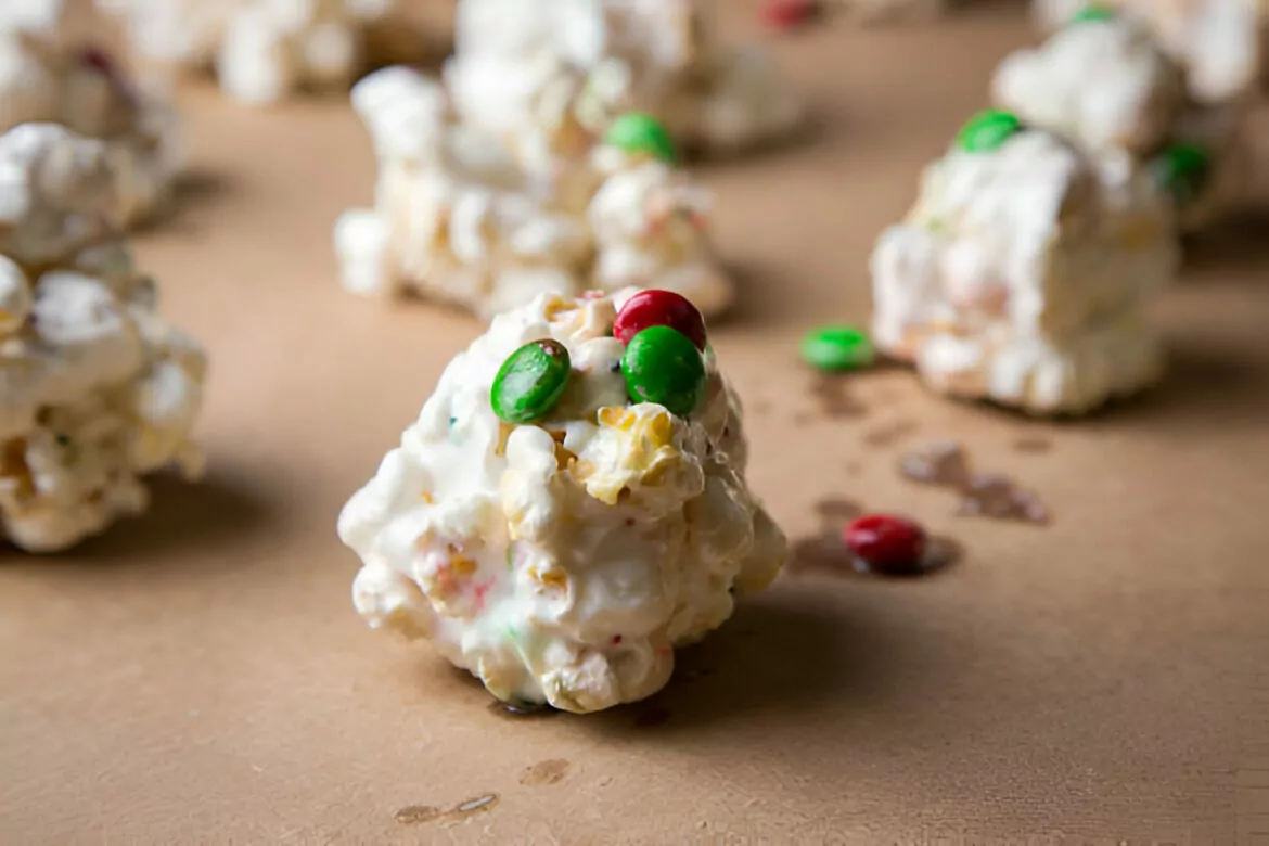 - The warmth from the marshmallow mixture and your hands while shaping the balls may cause the M&M’s to melt slightly. To avoid this, press a few candies onto the outside of the popcorn balls right after shaping them.