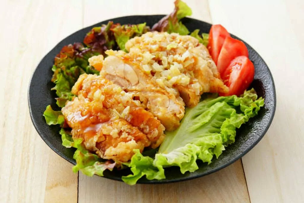 At the heart of the dish is the chicken breast — lean, tender, and coated in a delicate layer of katakuriko, or potato starch. This Japanese ingredient creates an ultra-light crust that crisps up beautifully when fried, locking in moisture while giving the meat a satisfying bite. The marinade of soy sauce and sake seeps into the scored chicken, infusing it with subtle umami and depth.