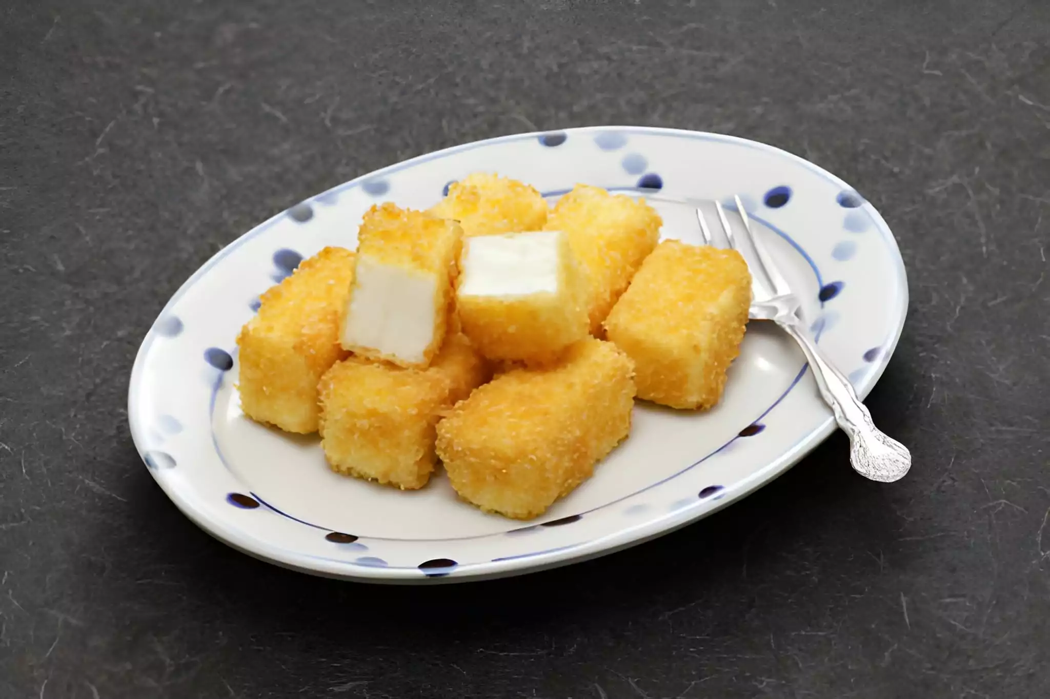 • Heat oil in a deep pan over medium-high heat to around 170°C (340°F). Fry the coated milk pieces in small batches for 4 to 5 minutes, or until golden and crisp on the outside. Remove with a slotted spoon and place on a wire rack or paper towels to drain excess oil.