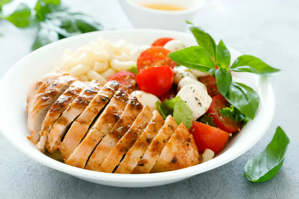 Arrange the grilled chicken strips, fresh mozzarella pearls, cherry tomatoes, and sliced fresh basil over the pasta. Serve immediately and enjoy the vibrant flavors of this dish!