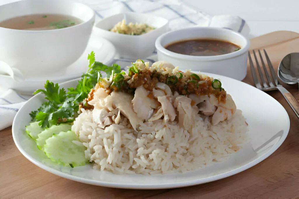 To serve, carve the chicken into bite-sized pieces and plate with a mound of fragrant rice. Offer the sauces on the side, along with a bowl of hot, clear broth and optional cucumber slices for freshness.