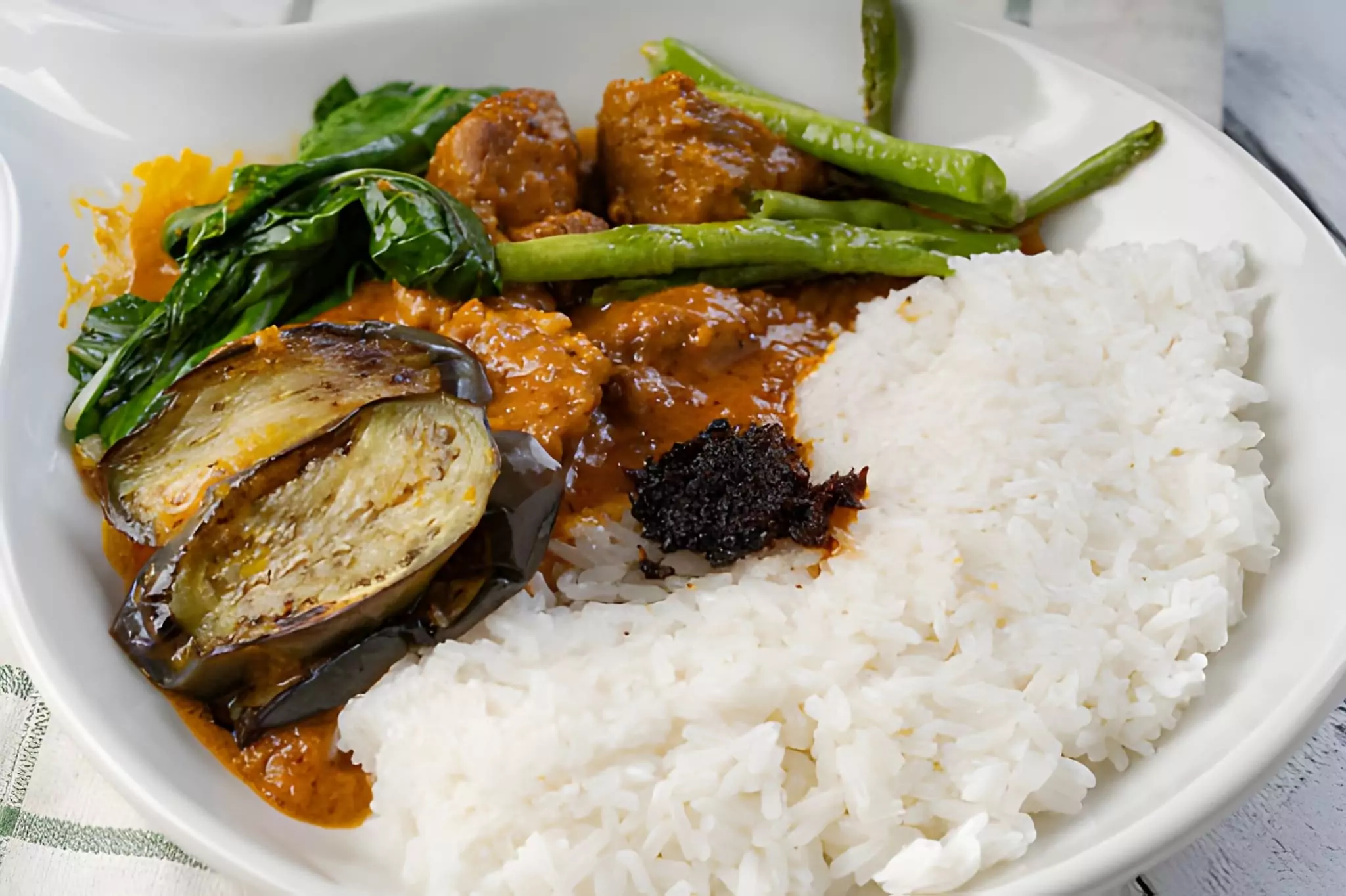 The selection of vegetables provides contrast and freshness. Banana blossom lends an earthy, slightly floral undertone, while eggplant and string beans contribute texture and a mild sweetness that balances the richness of the sauce. Bok choy adds a fresh, leafy note, completing the ensemble. Together, these ingredients create harmony — a balance of creamy, savory, and vegetal flavors that make Kare Kare deeply satisfying.
