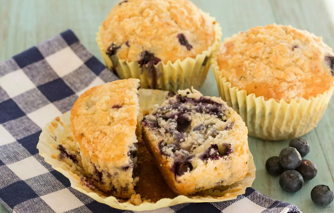 To prevent the blueberries from sinking to the bottom of the muffins, toss them lightly in a bit of flour before folding them into the batter.