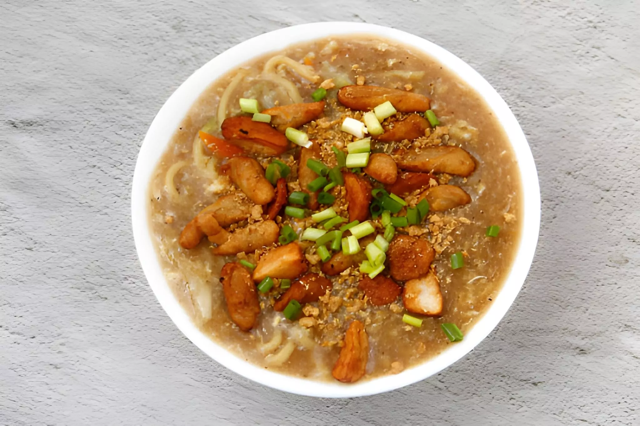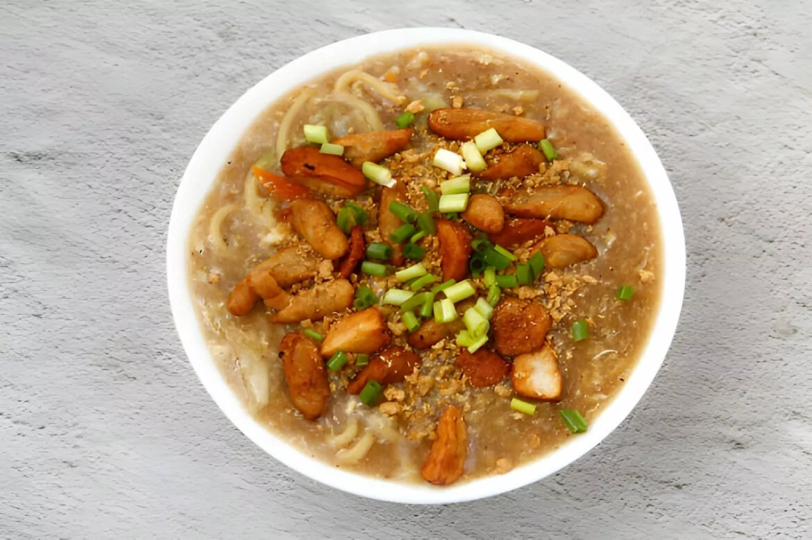 The broth, simmered with garlic, onion, soy sauce, and fish sauce, becomes a savory elixir that coats every noodle strand. Cassava flour plays a vital role in thickening the soup, giving it a smooth and velvety finish. Toppings like chicharon, hard-boiled eggs, and scallions complete the dish — adding crunch, creaminess, and freshness that balance the hearty base.