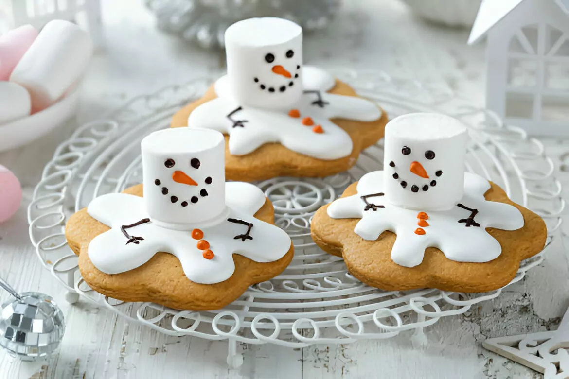 - Frost each sugar cookie with the white icing, allowing it to naturally drip over the edges for a melted effect. Quickly position a marshmallow half near the back of each cookie to form the snowman’s “head.”