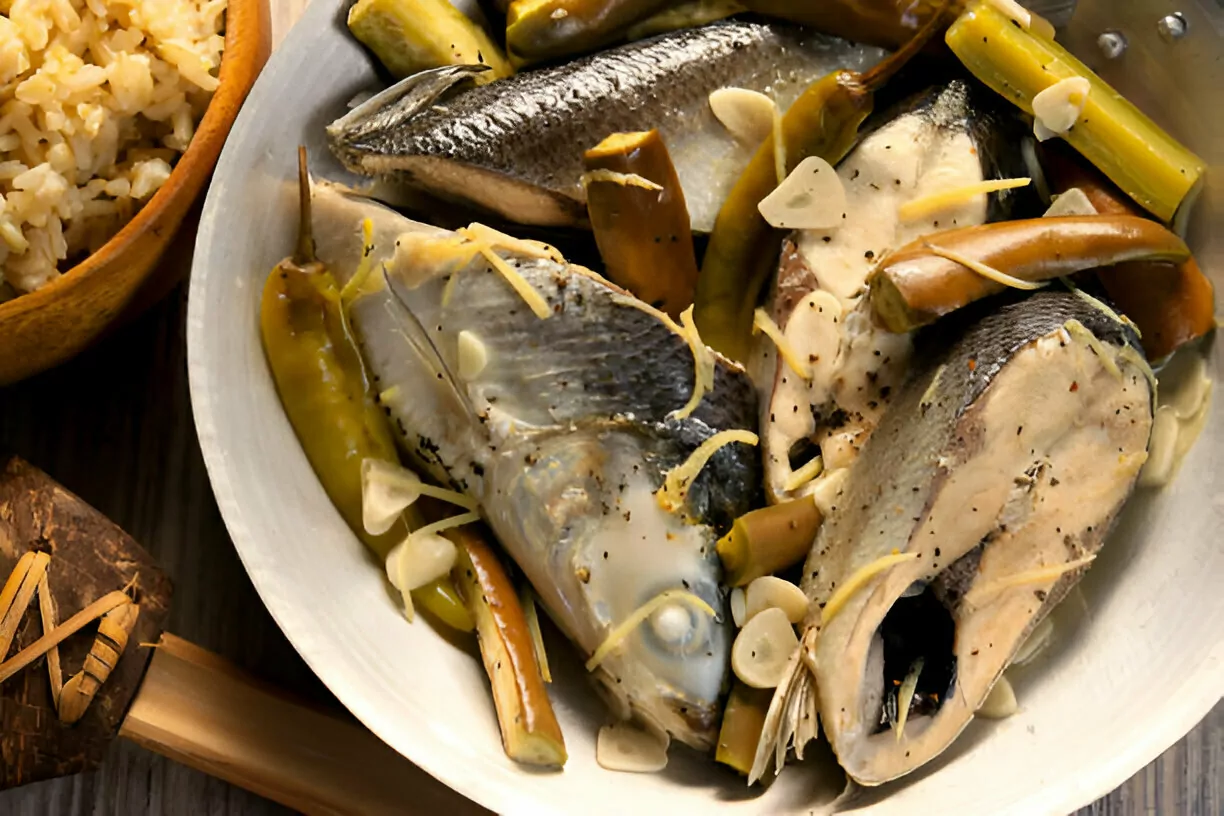 The star of this dish is the milkfish, or bangus, known for its tender white flesh and distinctive flavor. Keeping the scales on during cooking helps protect the delicate meat from breaking apart too easily and adds a subtle texture to the stew.