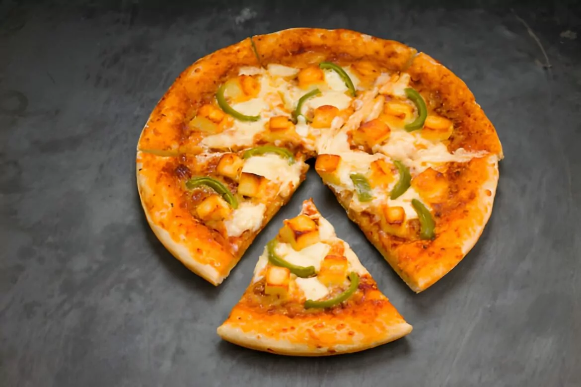 The flavorful paneer topping mix is where the magic happens. Cubes of fresh paneer absorb the warmth of spices and the richness of mozzarella, blending beautifully with sautéed capsicum and onions. The sweetness of onions, the crunch of bell peppers, and the creamy mildness of paneer together form a balance that’s both comforting and exciting. A light layer of pizza and tomato sauce ties these ingredients together with a subtle tang, preparing the stage for melted cheese to seal it all.