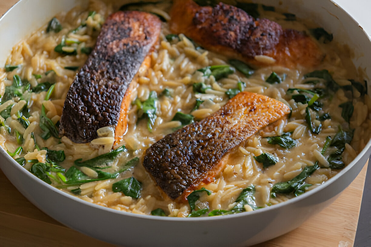 A perfectly seared salmon fillet paired with creamy, herb-infused Parmesan orzo. A balance of textures and flavors, combining the richness of the salmon with the velvety pasta. A restaurant-quality dish that comes together effortlessly at home.