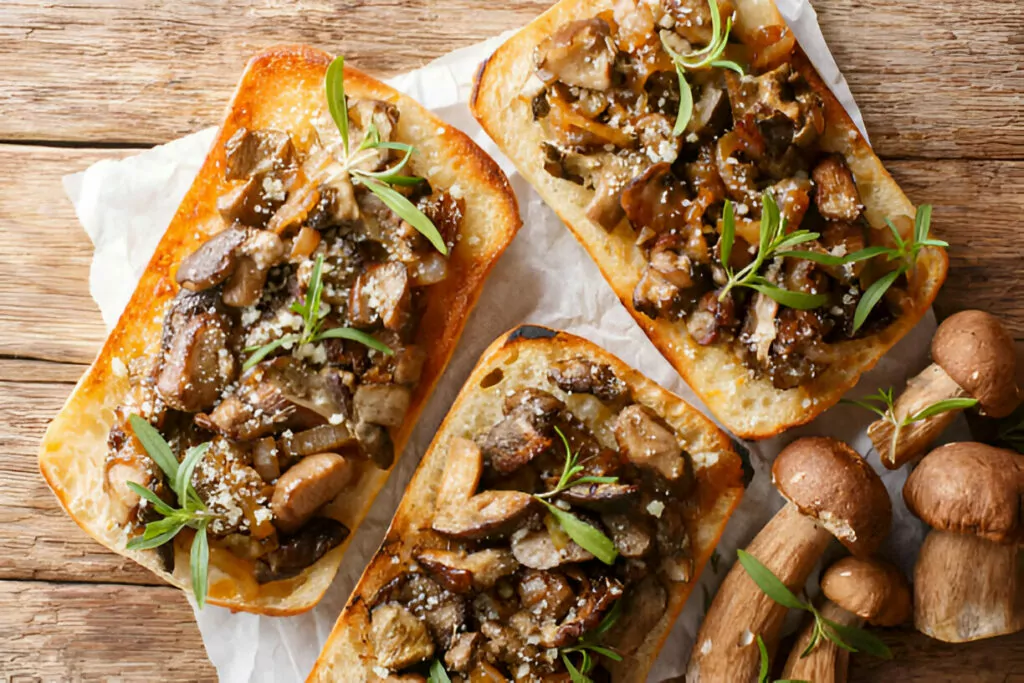 - Finally, spoon a generous portion of the savory mushroom mixture onto each toasted baguette slice. Serve immediately, garnished with fresh parsley for added color and freshness. Enjoy warm.