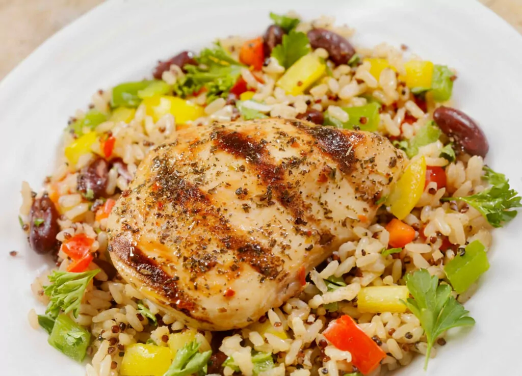 This quinoa and brown rice chicken salad is everything you want in a meal: refreshing, filling, and effortlessly colorful. With juicy golden-seared chicken, a hearty grain base, and vibrant crisp vegetables, it’s a bowl full of textures and flavors that come together in perfect harmony.