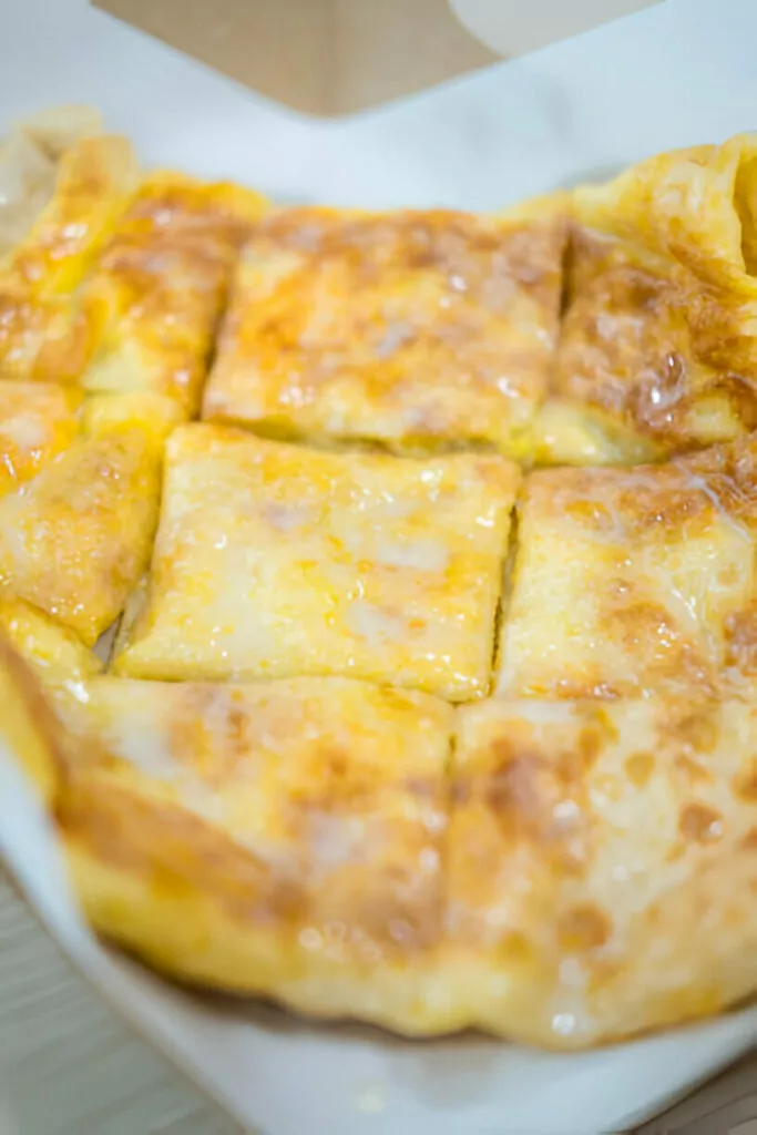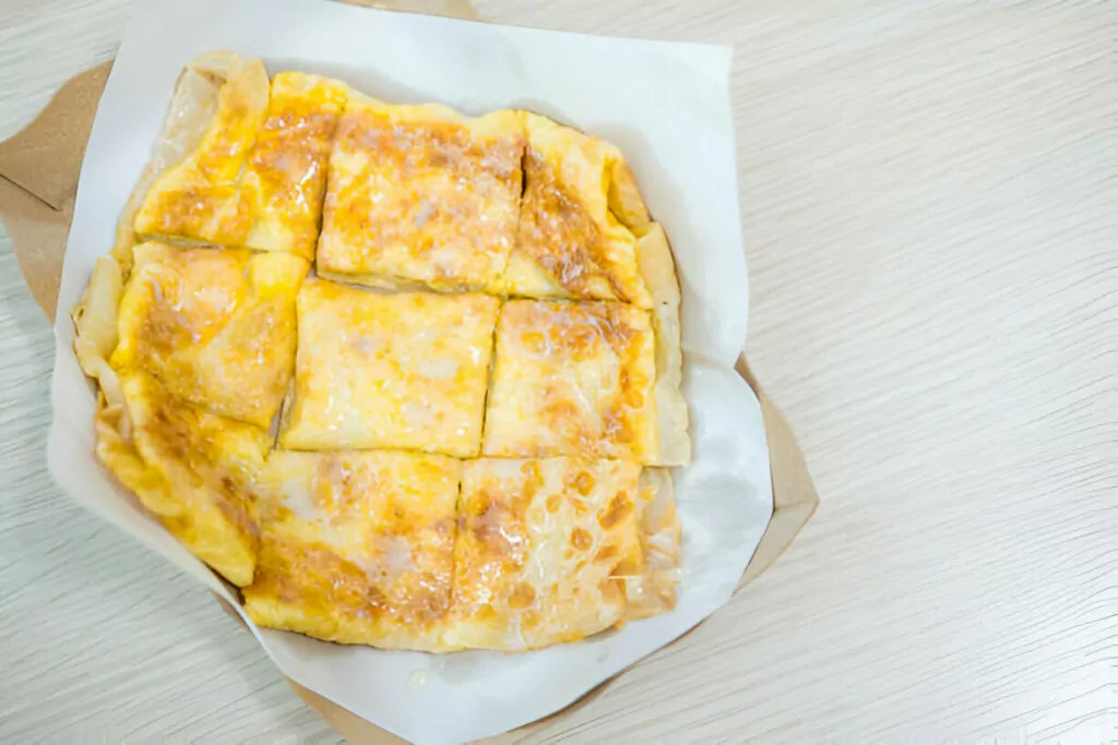 Crisp on the outside, soft on the inside, and dripping with warm, creamy sweetness—this roti is the kind of comfort food that feels like a hug. It’s pan-fried to golden perfection and filled with sweet banana and egg, then finished with a generous pour of condensed milk that melts into every corner.