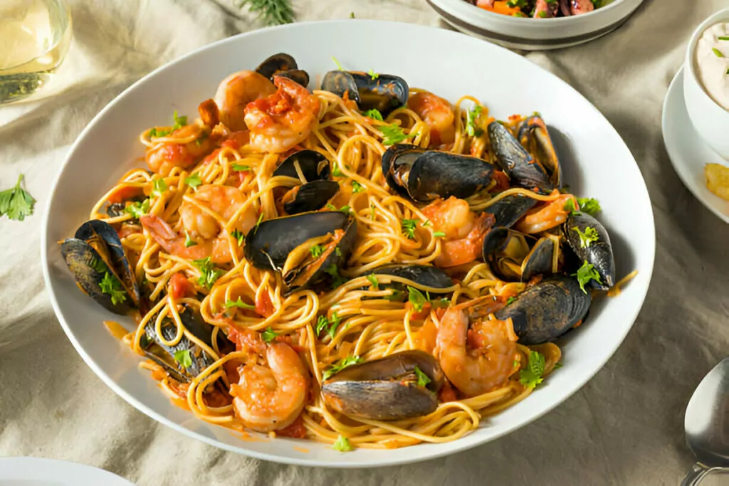 - Once the mussels are ready, return the shrimp to the pan. Add the cooked pasta and toss everything together, ensuring the sauce coats each strand evenly. If the mixture seems dry, drizzle in a bit more olive oil or a spoonful of reserved pasta water.