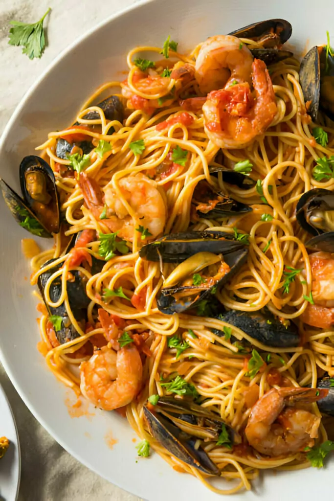 - Plate the pasta with generous helpings of shrimp and mussels. Garnish with the remaining parsley and a lemon wedge on the side. Finish with a light drizzle of olive oil and a pinch of freshly cracked black pepper just before serving.
