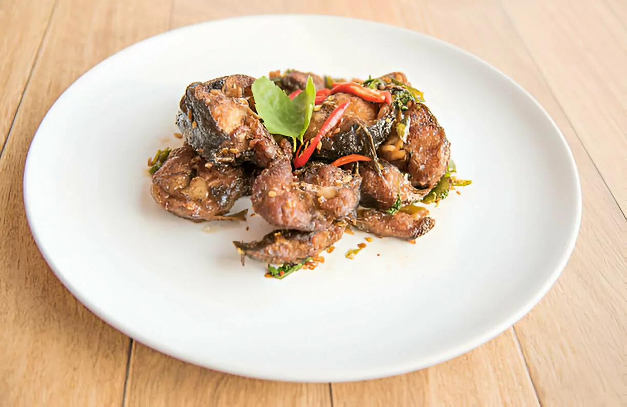 An aromatic Thai-inspired stir-fry that brings together crispy catfish, fiery curry paste, and fresh herbs. This bold, colorful dish is layered with textures and flavors, offering a perfect balance of heat, sweetness, and savory depth. With each bite, you’ll experience the crackle of fried basil, the richness of golden catfish, and the unmistakable fragrance of red curry mingled with kaffir lime.