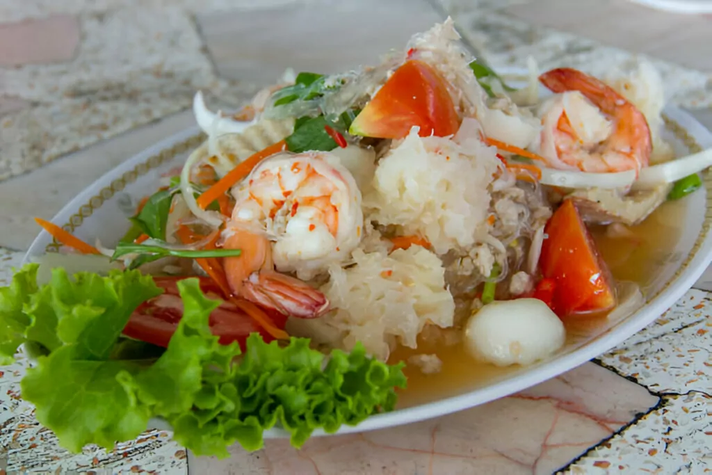 - To serve, divide the salad among plates or bowls. Sprinkle with crushed roasted peanuts for added texture and a hint of nutty depth. Serve immediately while the herbs are fresh and the dressing is vibrant. Enjoy the burst of spicy, sour, sweet, and salty in every bite.