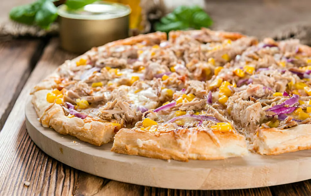 Canned tuna in brine is ideal for this recipe—light, lean, and flaky. Drain it thoroughly and gently separate it with a fork to make spreading it over the pizza easier. Its saltiness contrasts nicely with the sweetcorn, creating a well-rounded bite.
