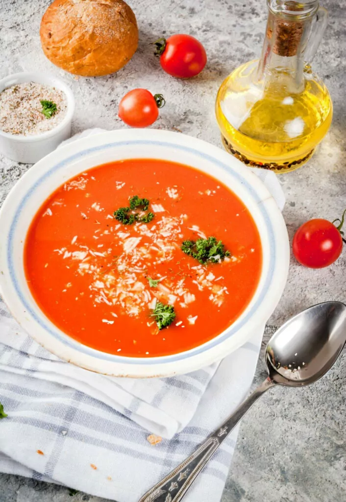 A bowl of tomato Parmesan soup practically begs for something to dip. Crusty sourdough bread, garlic toast, or cheesy flatbread makes the perfect partner. To lighten the meal, add a simple green salad dressed in tangy vinaigrette—the acidity cuts through the soup’s richness beautifully. For a heartier option, a melty grilled cheese sandwich turns it into a comforting full meal. It also shines as a first course before creamy pastas, buttery risottos, or roasted poultry mains, especially during the colder months.