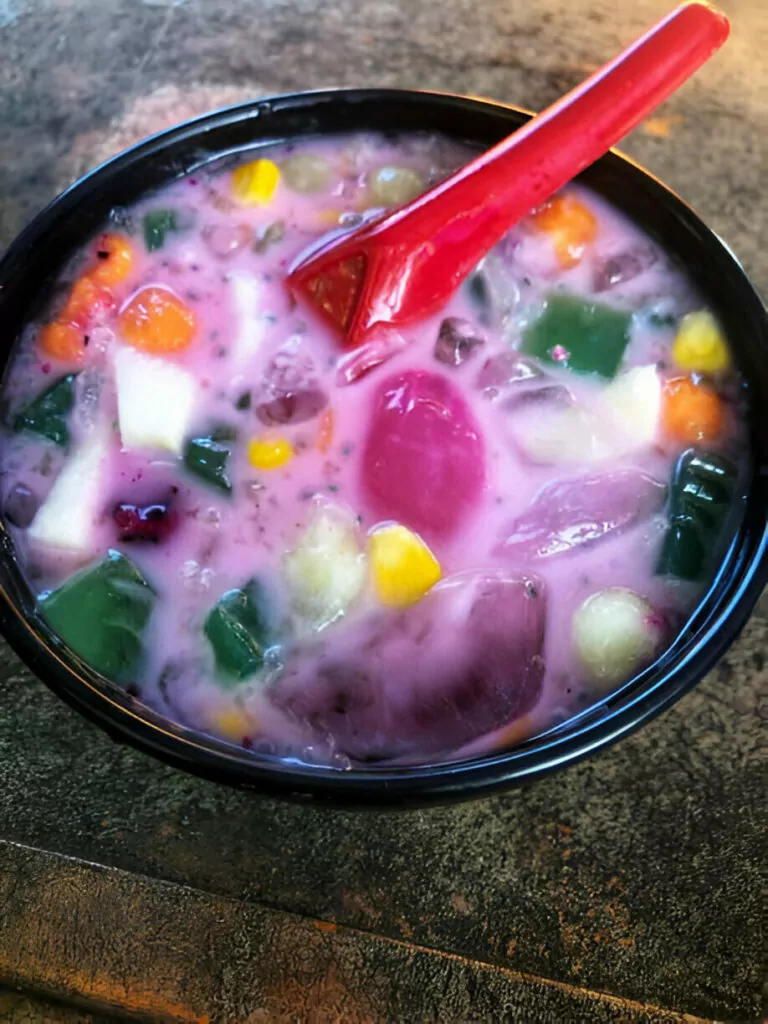- In serving bowls or glasses, arrange an assortment of the jelly pieces, fruits, and lychees. Pour the creamy milk broth over the mixture until well covered. Finish by adding a generous amount of ice cubes to keep everything refreshingly cold. Serve immediately and enjoy the burst of fruity, creamy flavors.